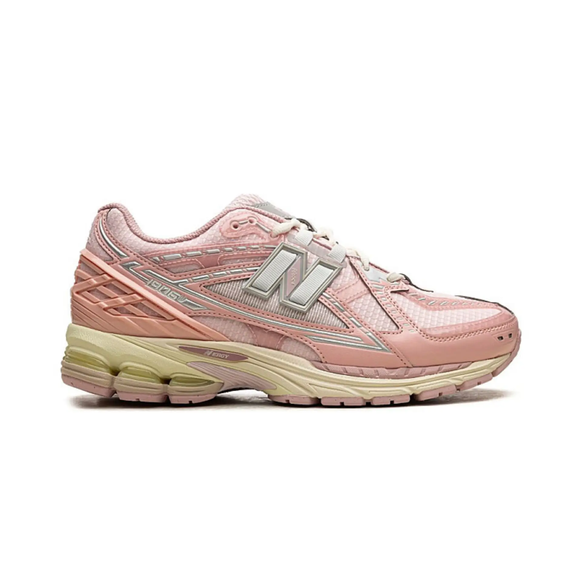 El upper está confeccionado en mesh transpirable rosa pastel, con superposiciones en cuero y sintético tono a tono, creando un diseño monocromático y sofisticado.
