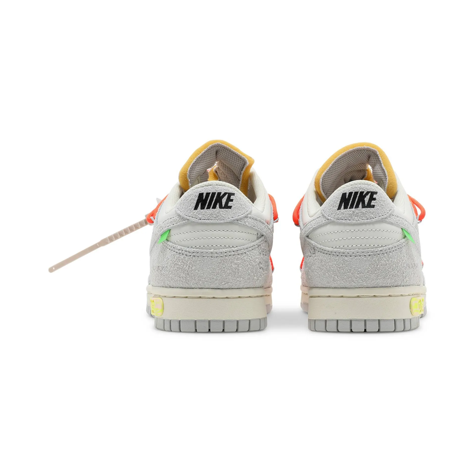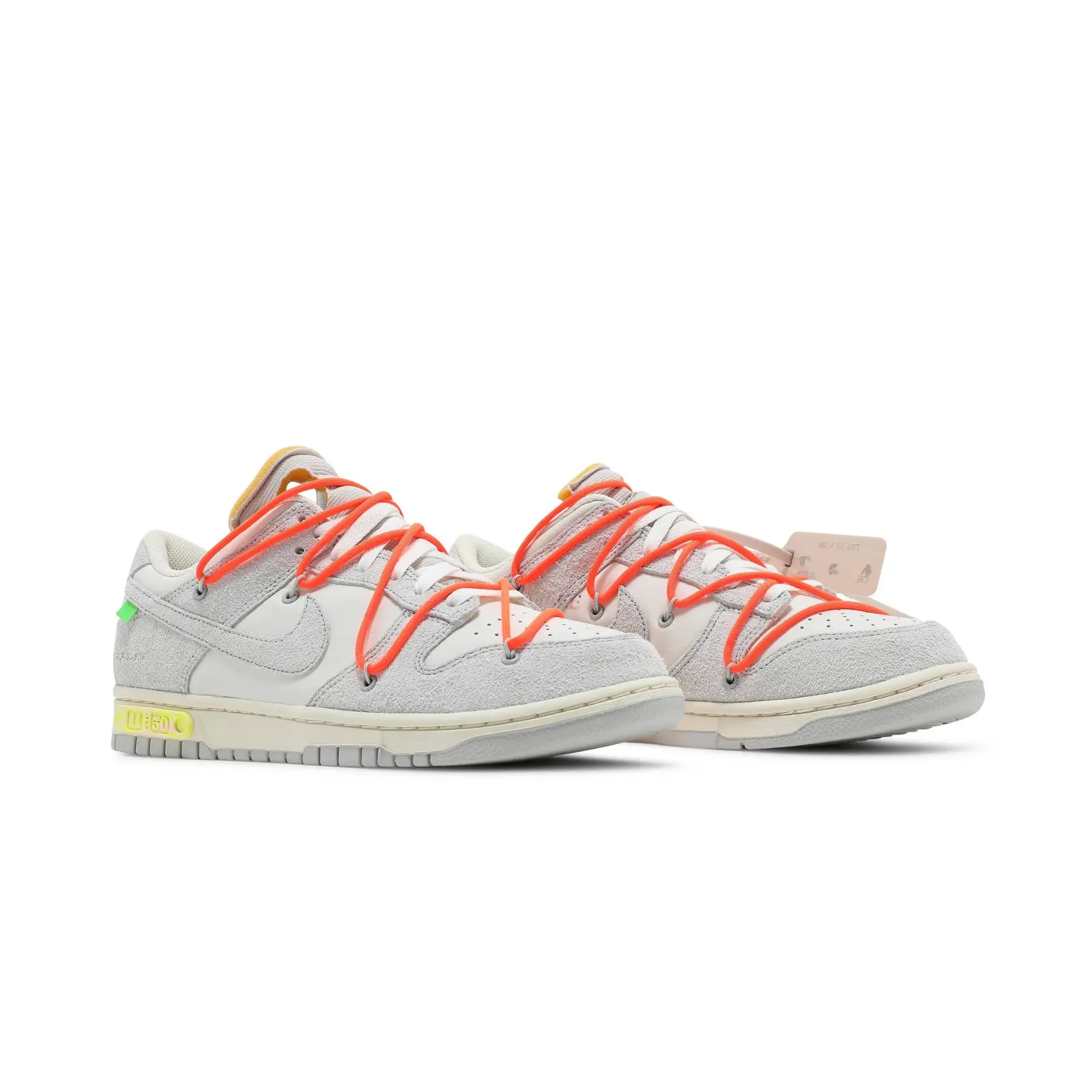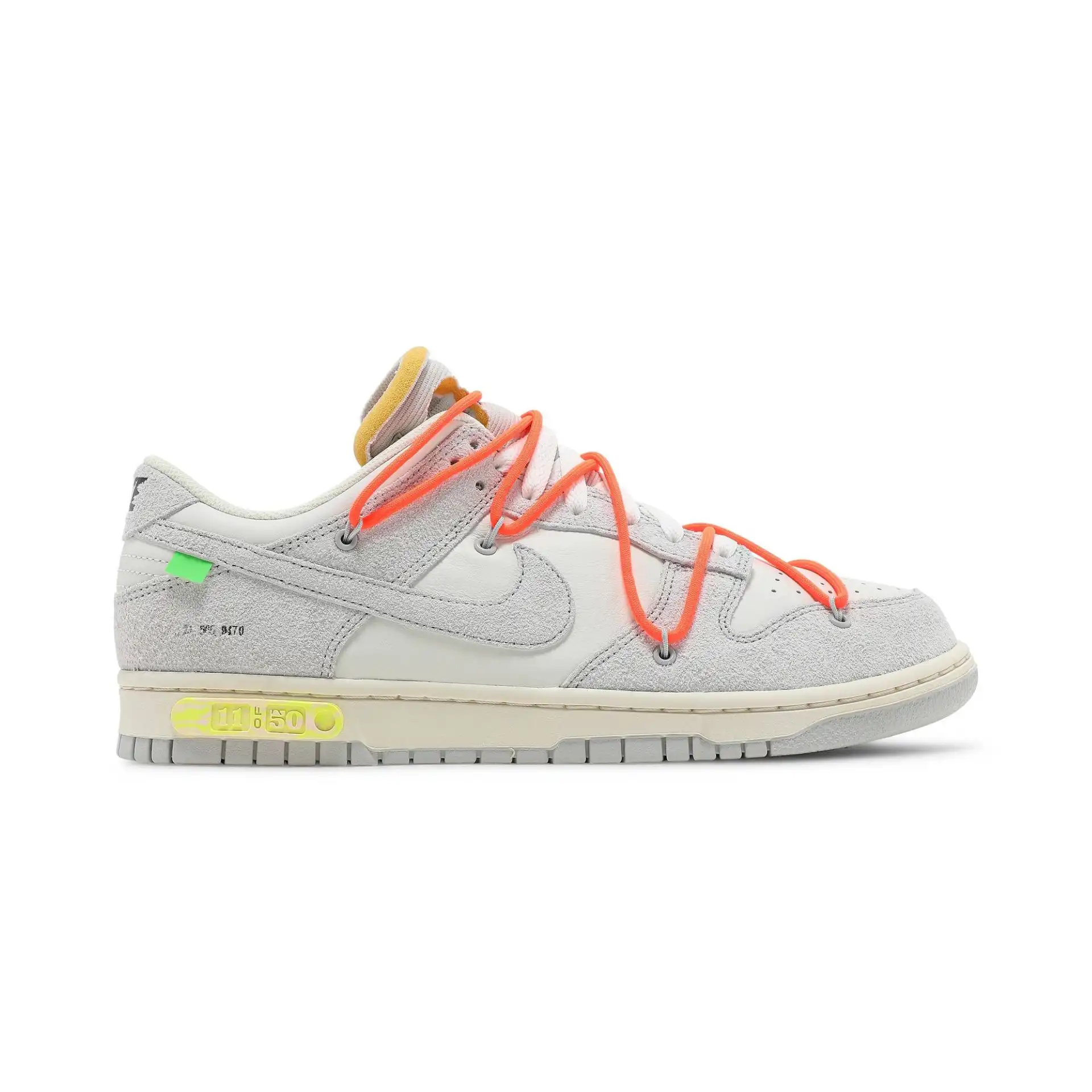 Las Nike Dunk Low Off White Lot 11 son parte del revolucionario pack “The 50” de Virgil Abloh. Esta edición combina materiales clásicos como piel blanca y lona gris con un sistema de cordones secundarios en naranja neón, otorgando un contraste energético y muy reconocible dentro de la colección.